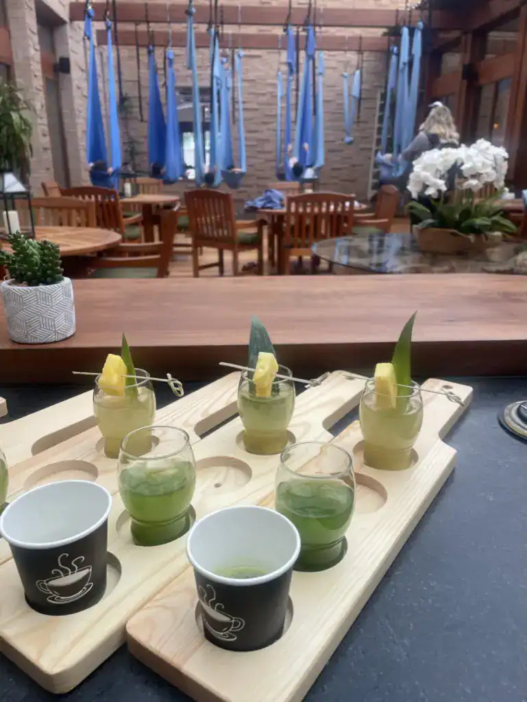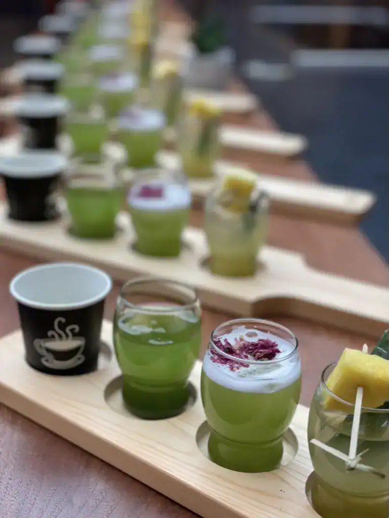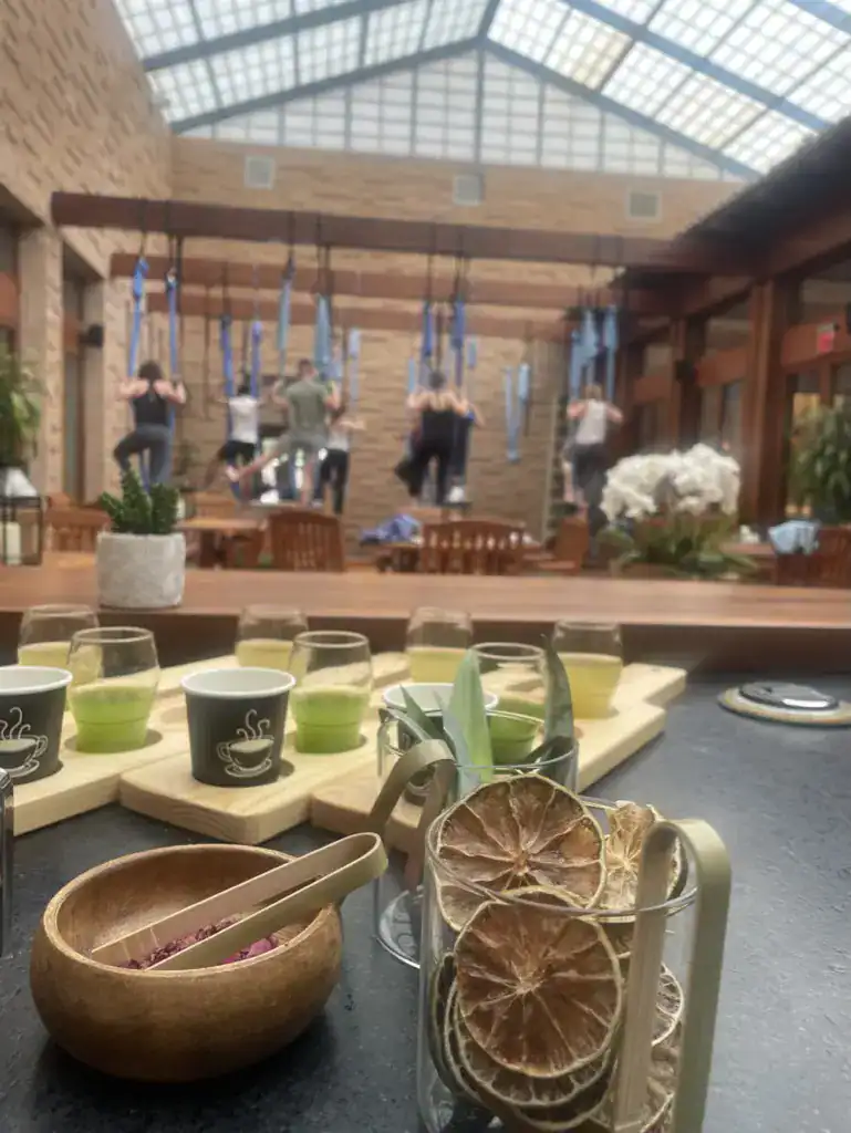 For this private corporate retreat in Scottsdale, we were invited to curate and moderate a wellness-focused breakout session that blended movement, mindfulness, and—of course—exceptional beverages. Guests began their morning suspended in serenity with aerial yoga inside the stunning atrium of the Scottsdale Princess Spa… sunlight, soft movement, and a quiet reset before the day unfolded. From there, we guided participants into a fully immersive matcha experience. Our team walked them through the rich history of matcha, the cultural significance behind traditional preparation, and the surprising health benefits that make it a powerhouse ingredient. Guests watched a live demonstration of the ceremonial whisking process before sampling four distinct pours: a classic hot matcha, a refreshing iced matcha, a rose-infused matcha latte, and a bright pineapple matcha cocktail that brought a playful twist to the tasting.